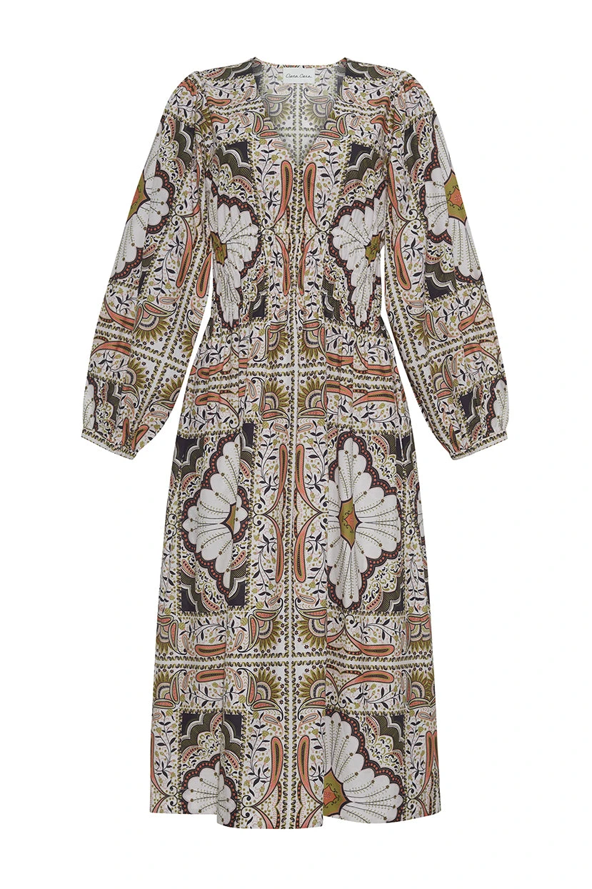 V-neck and elbow length puff sleeves with elastic cuffs. On-seam side pockets. Unlined. Placed print. Midi length.