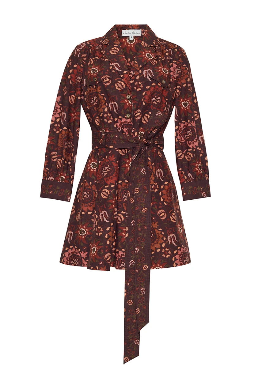 The Leona Dress turns the collared, shirtdress flirtatious, with a full flounced skirt cut to a mini length. The bahamian abstract floral cotton print offers cozy fall comfort, and self covered, gold eyelet summarys add to the vintage-inspired vibe.