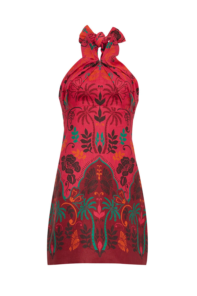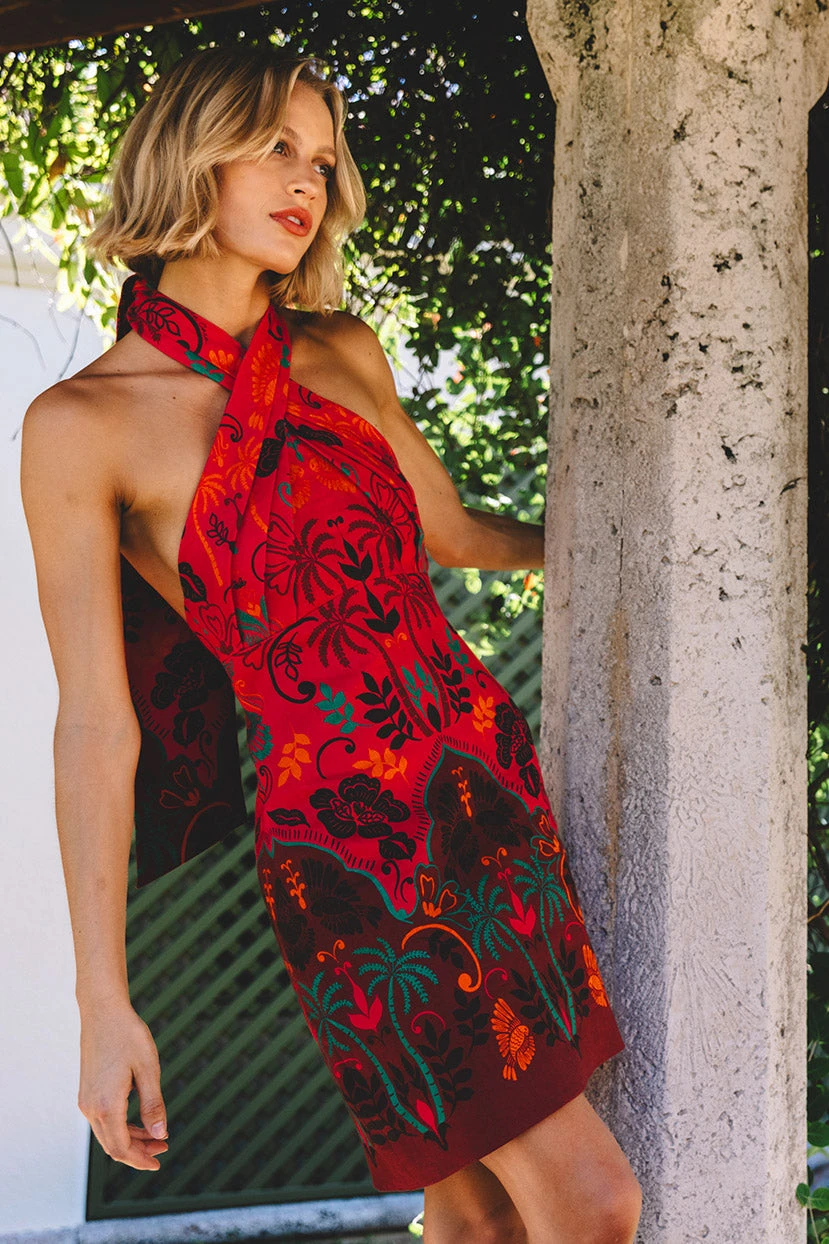 • Open back mini dress featuring a draped bodice with criss-cross halter neck that extends into self ties