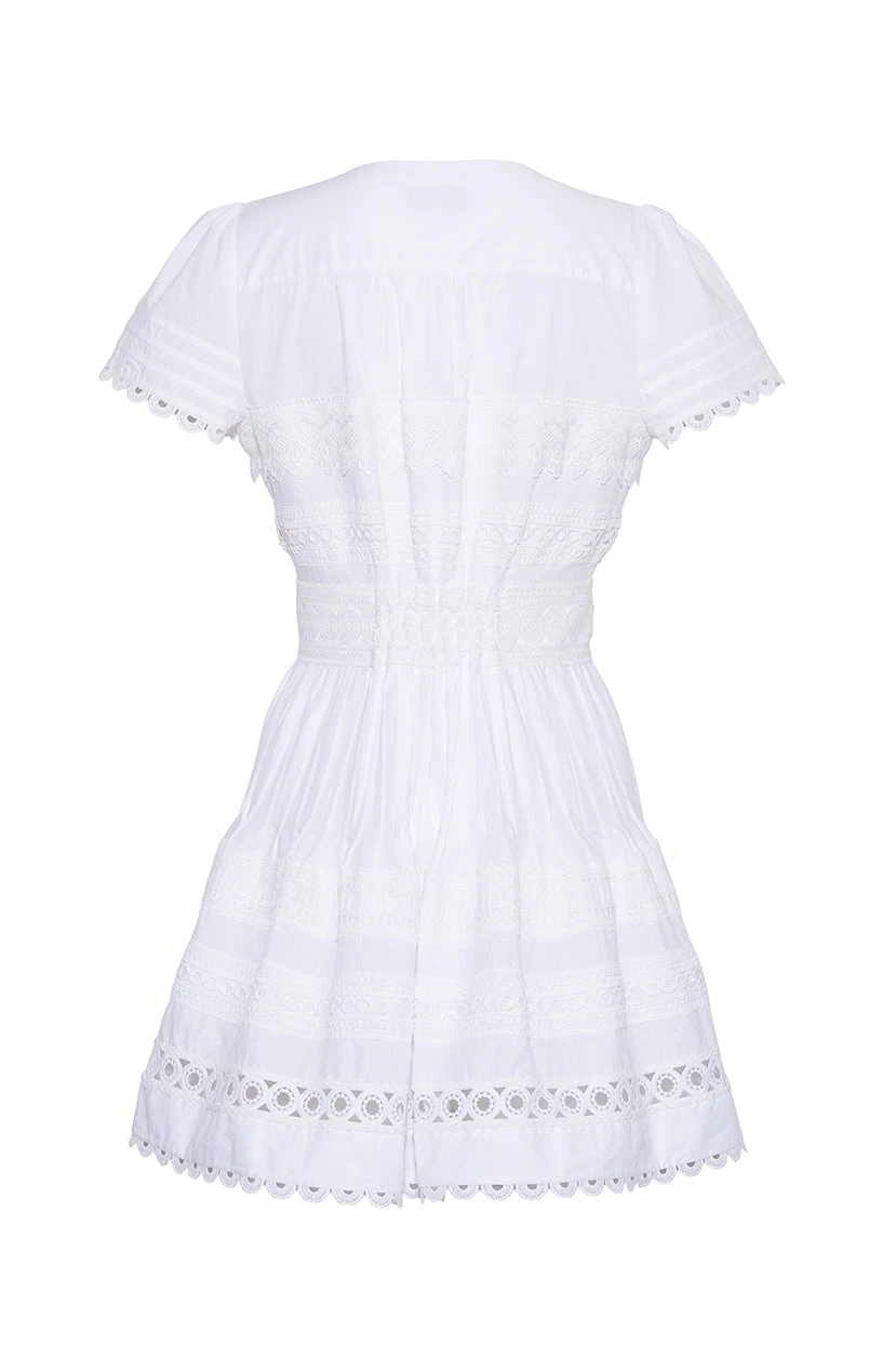 • Mini v-neck, short sleeve shirtdress with decorative lace inserts