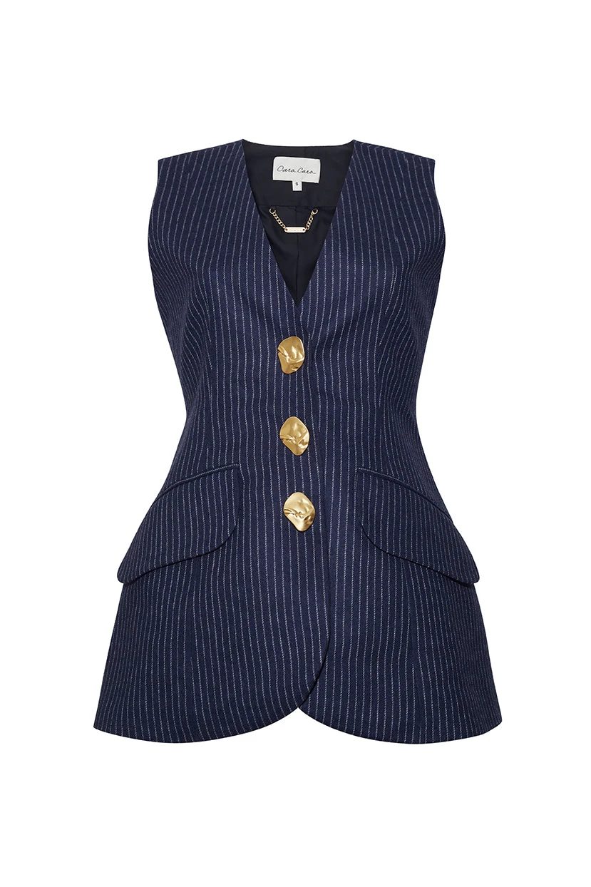 • Shaped, structured, long lined vest with functional flap pockets at front